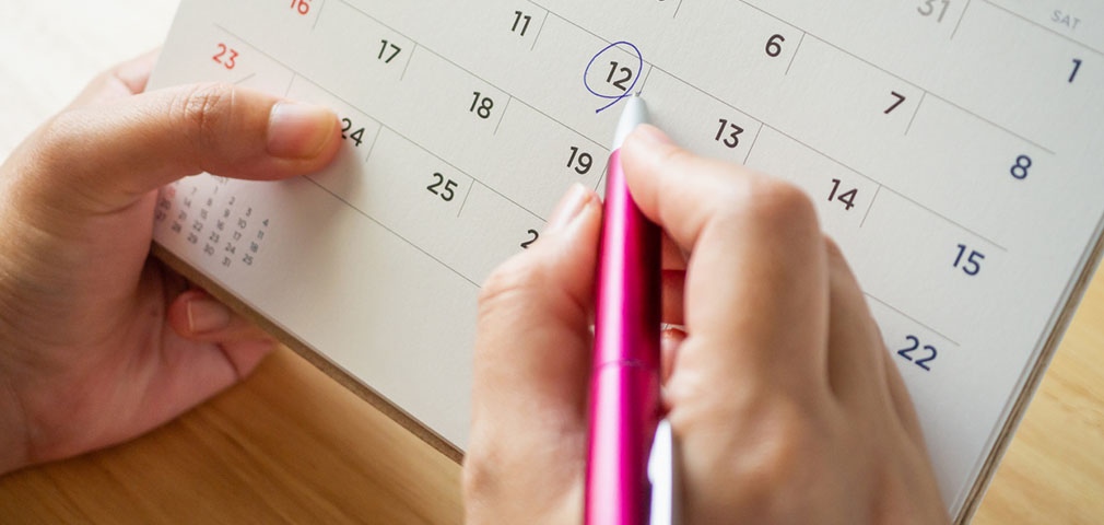 Calendar page with female hand holding pen on desk table